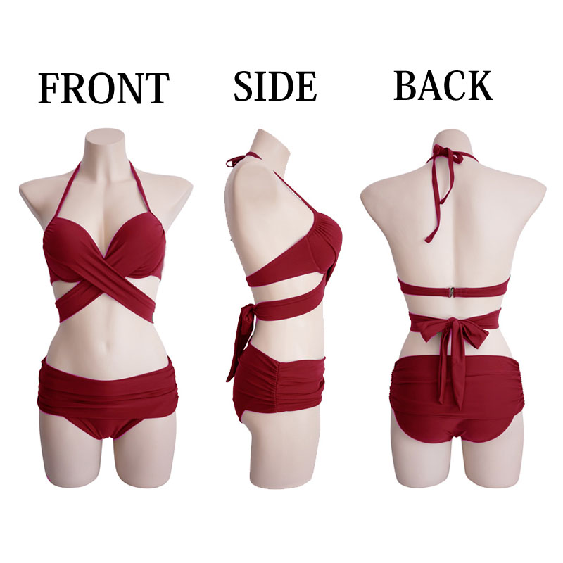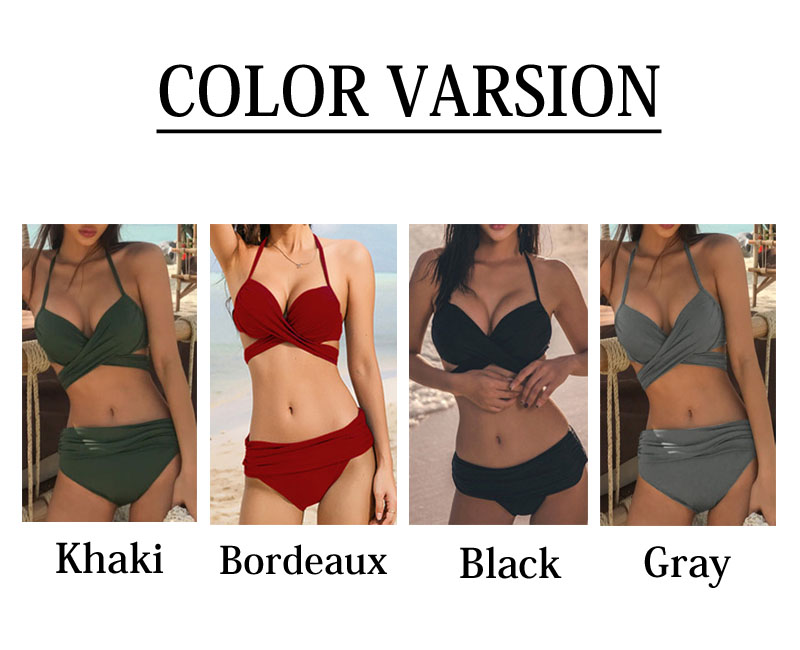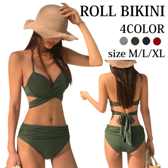 クロスバンドゥビキニ 新作 水着 レディース 4色 無地 アースカラー クロスバンドゥ無地 上下セット レディース水着 ビキニ バスト盛れる 体型カーバー 海 旅行 新婚旅行 温泉 海外 リゾート セレブ 送料無料 ホルターネック クロスカシュクール フロントクロス