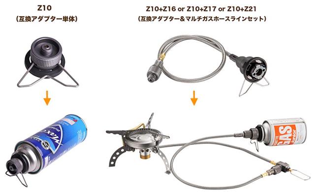 アダプターZ11はカセットボンベに対応する商品です。カセットボンベに付けることにより、OD缶に対するガス器具が使用可能になります。