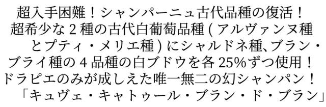 超入手困難!シャンパーニュ古代品種の復活!超希少な2種の古代白葡萄品種(アルヴァンヌ種とプティ・メリエ種)にシャルドネ種、ブラン・ブライ種の4品種の白ブドウを各25%ずつ使用!ドラピエのみが成しえた唯一無二の幻シャンパン!「キュヴェ・キャトゥール・ブラン・ド・ブラン」
