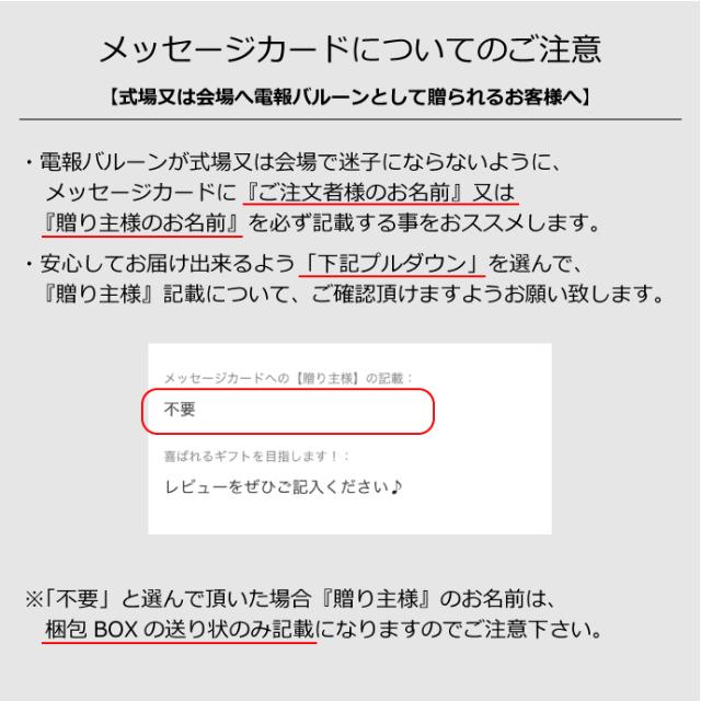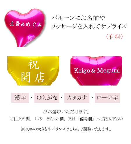| バルーンについての ご注意 ※ご確認下さい | ・気圧の関係上、空輸地域の発送不可(海外発送不可) 北海道・沖縄・離島へは発送できます。 ※沖縄は発送から約1週間程度かかります。 ・バルーンの印刷インクは体に無害ですが、なめたり水に濡らすとはがれ落ちる可能性があります。 ・バルーンには棒がついておりますので、小さいお子様にはご注意下さい。 |
