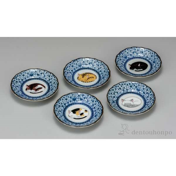 「送料無料」 九谷焼 皿揃 眠り猫 4号 5枚セット ( 退職祝い 定年 和食器セット お皿 揃える 食器 和食 九谷焼 結婚 出産 内祝い )