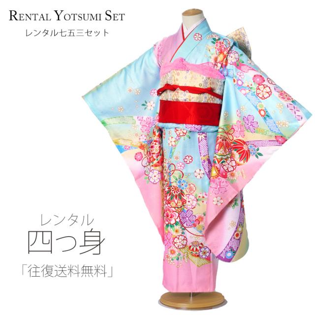 レンタル 四つ身 着物 花ひめ ブランド 七五三 7歳 貸衣装 水色 絵羽柄 鞠 熨斗