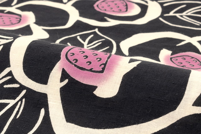紬調の生地に手描き風に描かれた抽象的な椿が注染(ちゅうせん)の風合いを生かしてデザインされています。