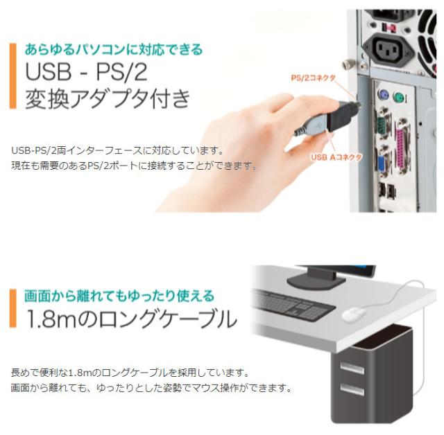 ■対応機種:Windows(DOS/V)パソコン、Apple Macシリーズ。※USBポート(Aタイプコネクタ)もしくはPS/2ポート(ミニDIN6pinコネクタ)を持つ機種。※USB-PS/2変換アダプタはWindowsのみの対応です。※PS/2接続の場合は、内蔵ポインティングデバイスとの併用はできません。