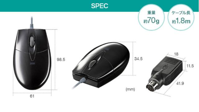 ■サイズ:マウス/約W61×D98.5×H34.5mm、USB-PS/2変換アダプタ/約W18×D41.9×H11.5mm