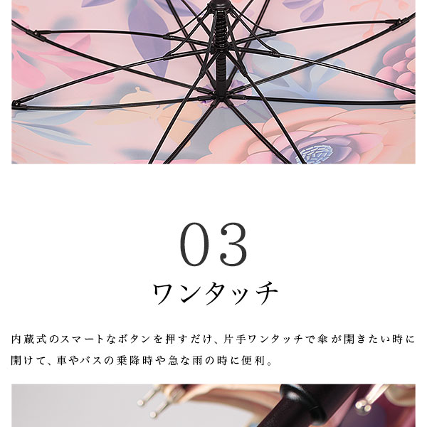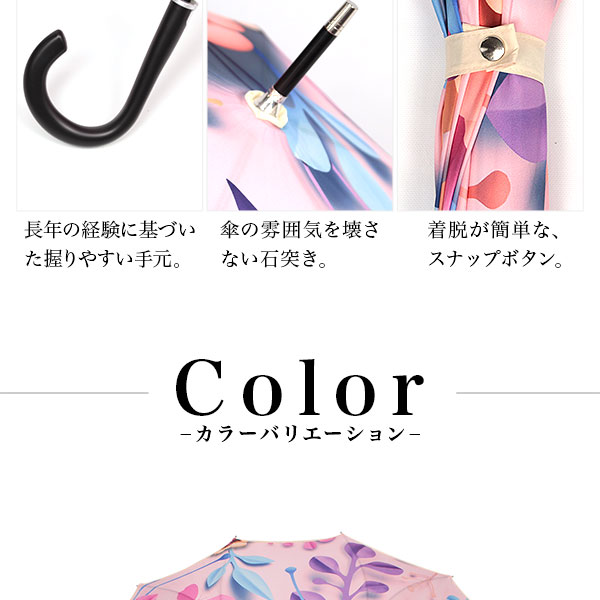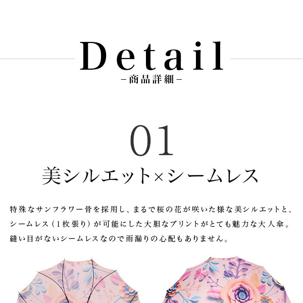 シームレス(1枚張り)が可能にした大胆なプリントがとても魅力的な大人傘。縫い目がないシームレスなので雨漏りの心配もありません。