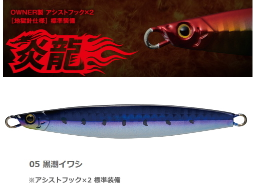 左右に飛び踊る【炎龍】。重心をジグの中央に配置し、断面をひし形にすることでロッドアクションにより横方向のスライドを容易に演出できる。また、沈下中にヒラヒラと不規則な