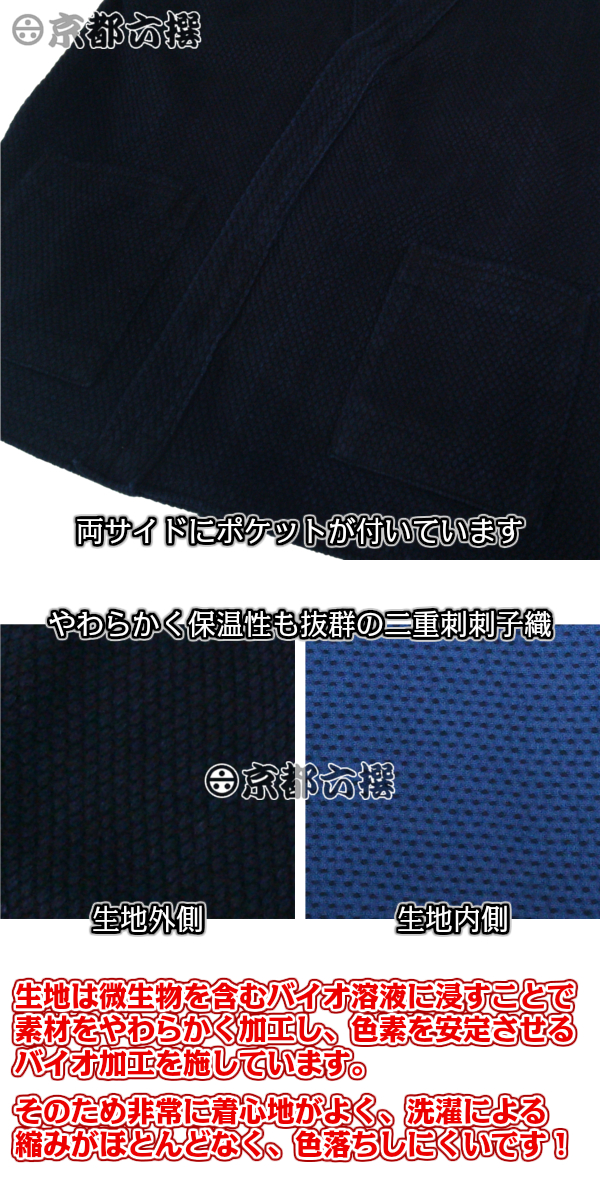 柔道着や火消し半纏などに使われる丈夫な二重織刺子生地を使用。刺子の生地の目が空気を含んでいるため保温性が高く、手触りも非常にやわらかく仕上がっています。