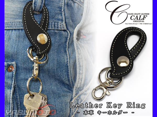 CALF 本革 キーホルダー ブラック 黒 レザー キーリング 牛革 ステッチ シンプル おしゃれ メール便 送料無料