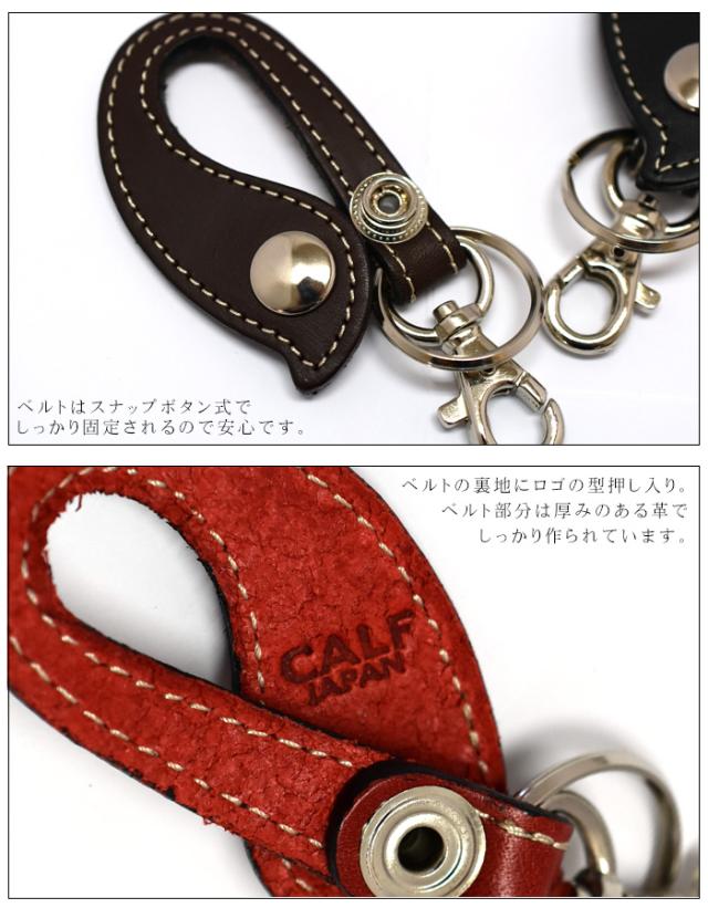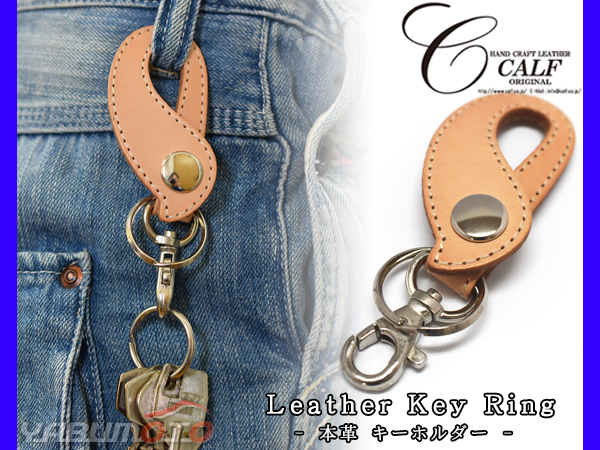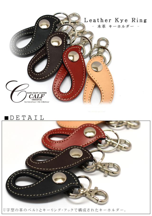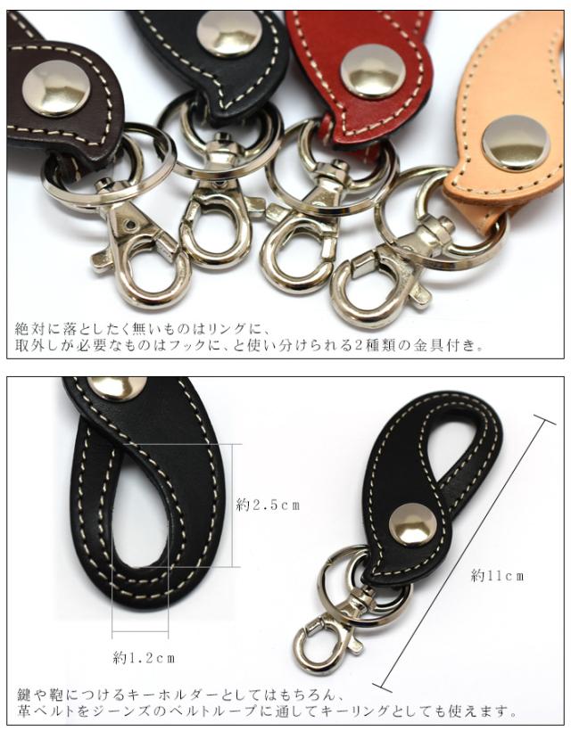 ——革を知り尽くしたクラフト工房CALF(カーフ)の職人が ひとつひとつの工程すべてにこだわった本物の革製品—— U字型の革ベルトとキーリング・フックの二種類の金具が付いたキーホルダー。革のベルト部分は装飾の少ないシンプルなデザインながら、滴のような個性的な丸い形とステッチで存在感あり。二種類の金具は取り付けるものに合わせて選べて便利です。鞄や鍵に取り付けてキーホルダーとしてはもちろん、革ベルトの部分をジーンズのベルトループなどに通してキーリングとして使用するのもおしゃれです。■サイズ横 約4cm × 縦 11cm※横幅は左右の一番出っ張っている部分を計測しております ■色 タン