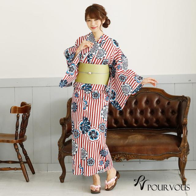 ★赤いストライプに青い花手毬をあしらった、ポップで可愛い浴衣。