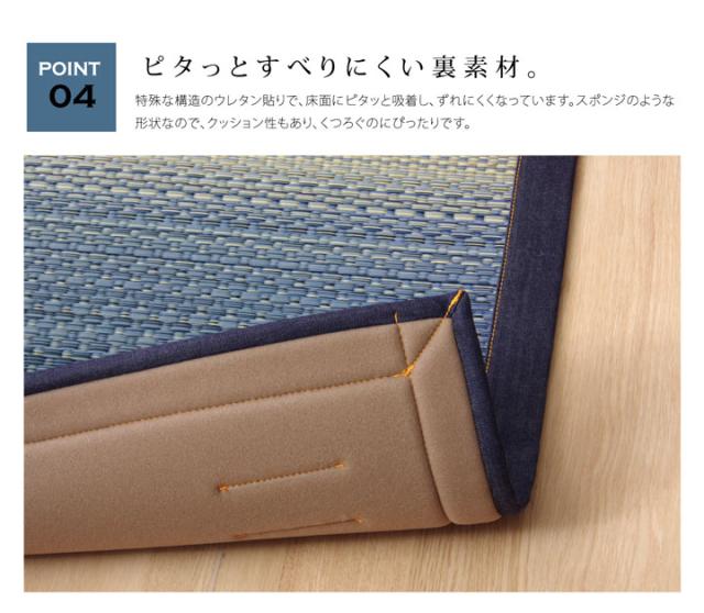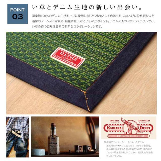 | ■広島県のデニム生地メーカーとコラボした商品です。デニムの生地をヘリに使用しました。■カラフルない草とデニムは相性ばっちりです。お部屋の雰囲気をがらりと変えてくれる商品です。■イ草生地は袋織りという技法で繊細な柄を出しています。折れ曲がりが複雑なので長いイ草を使用しないと切れてしまいます。縦糸が密なので、しっかりとして破れにくいのが特徴です。■国産(九州産)のい草を使用しています。一本一本が太く、表皮が厚く繊維がキメ細かいので弾力性があり、耐久性に優れています。■い草には空気の自然浄化作用、湿度の調節作用などがあります。■裏には国産のウレタンを使用しほどよいクッション性を持たせました。■い草に青森ヒバ加工を施しています。(抗菌、防臭効果) | |