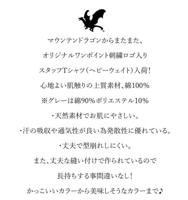 マウンテンドラゴンからまたまた、 オリジナルワンポイント刺繍ロゴ入りスタッフTシャツ(ヘビーウェイト)入荷! 心地よい肌触りの上質素材、綿100% ※グレーは綿90%ポリエステル10% ・天然素材でお肌にやさしい。 ・汗の吸収や通気性が良い為発散性に優れている。 ・丈夫で型崩れしにくい。 また、丈夫な縫い付けで作られているので長持ちする事間違いなし! かっこいいカラーから美味しそうなカラーまで♪ | |||||||