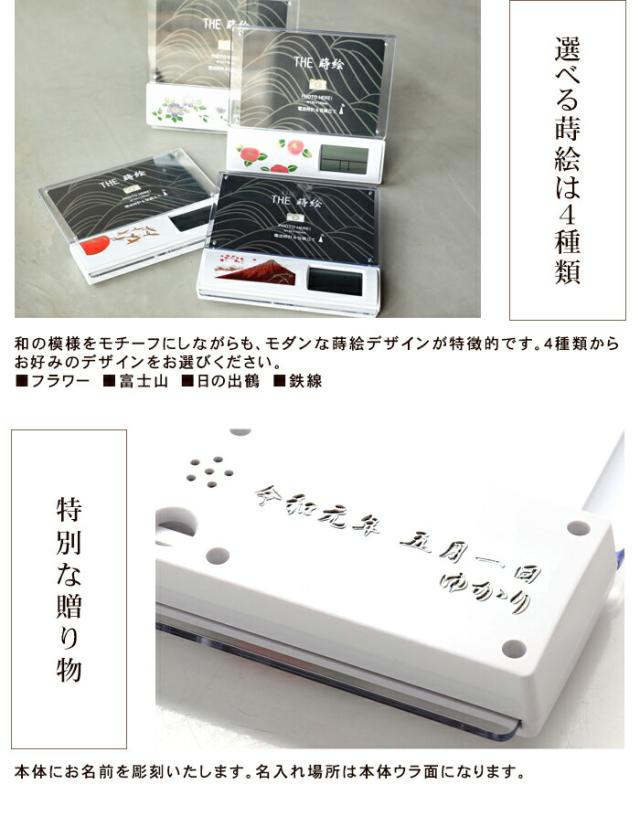 | 紀州漆器の蒔絵職人が丁寧にひとつ、ひとつ蒔絵を施した電波時計&写真立てです。 機能性に優れた電波時計と思い出の写真をリビングや寝室に。 写真は一般的なL判対応(15×10cm)です。四隅の磁石で写真の差し替えが簡単です。 時刻が正確な電波時計です。日付、温度計、アラーム機能も付いています。 世界で一つの名入れギフト。名前を彫ると世界にたった一つのオリジナル品に! 無料で名入れ、文字入れをいたします。名入れ、文字入れ場所は裏側になります。 和の模様をモチーフにしながらも、モダンな蒔絵デザインが特徴的です。 4種類からお好みのデザインをお選びください。 専用箱に入っていますので、贈り物にも安心です。 ギフト包装は無料で承っております。ご注文時にご指示ください。 |