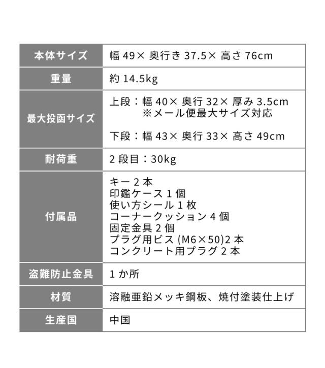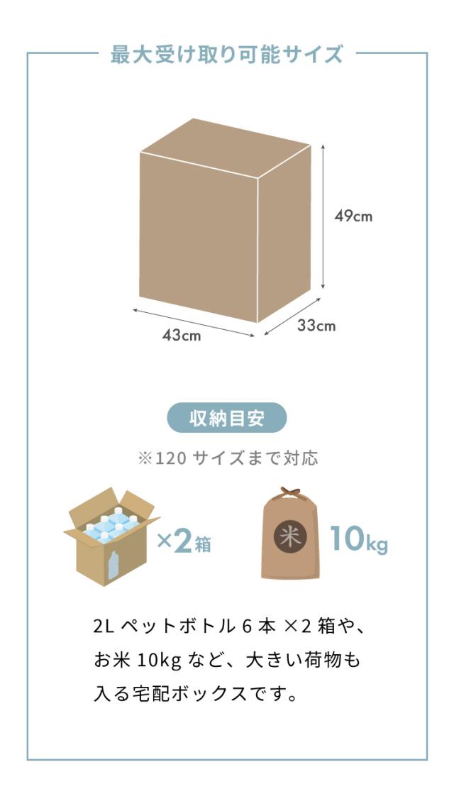 2Lペットボトル6本×2箱や、お米10kgなど、大きい荷物も入る宅配ボックスです。