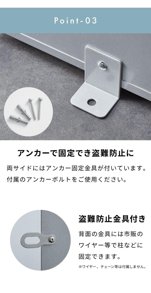ボックス背面に盗難防止用の金具が付いています。市販のワイヤー等で固定することが可能です。