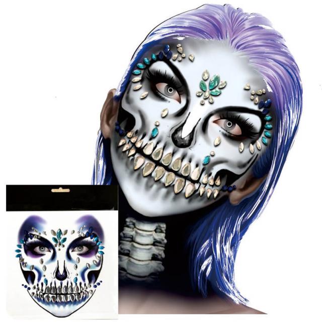 フェイス用(目元・アイブロー用) ジェムボディステッカー (デススカル) 1シート 貼る シール アクセサリー クリスタル レディース メンズ 男 女 おもしろ 面白い 顔 ラインストーン ドクロ 骸骨 髑髏 がい骨 クリア 透明 青色 ブルー 化粧 メイク 花嫁 パレード ダンス