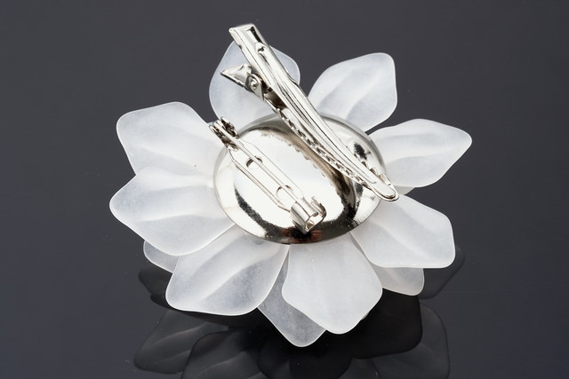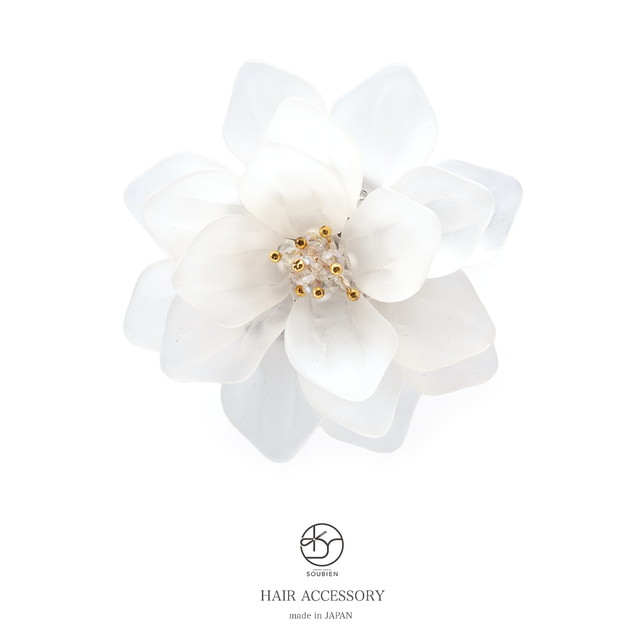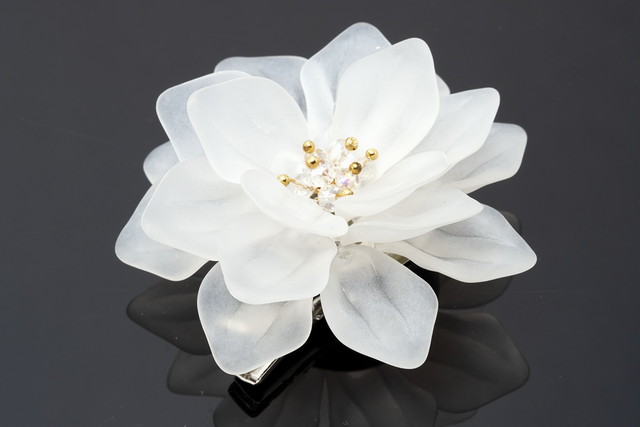 透明感のある樹脂で花びらが作られた清涼感溢れるデザインです。花の中心にはクリアビーズが施され、優美な印象です。