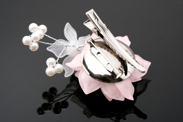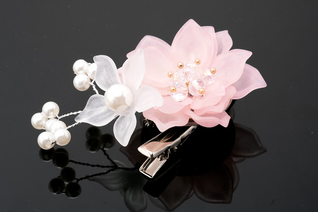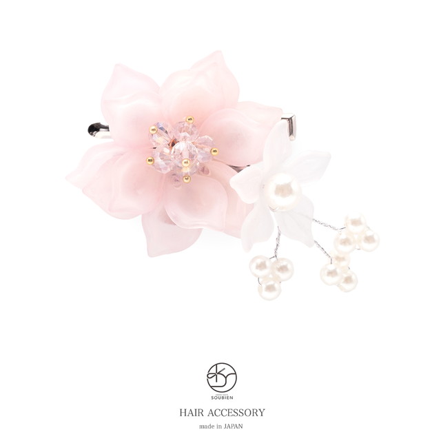 透明感のある樹脂で花びらが作られた、清涼感溢れるデザインです。花の中心にはクリアビーズやフェイクパールが施され、優美な印象です。