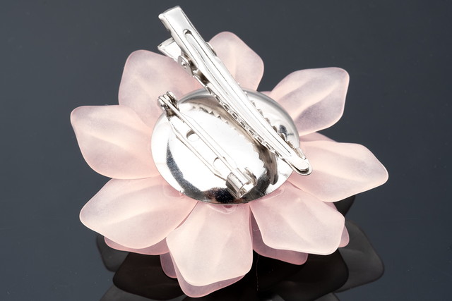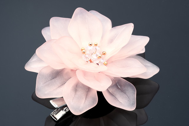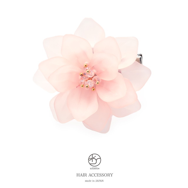 透明感のある樹脂で花びらが作られた清涼感溢れるデザインです。花の中心にはクリアビーズが施され、優美な印象です。