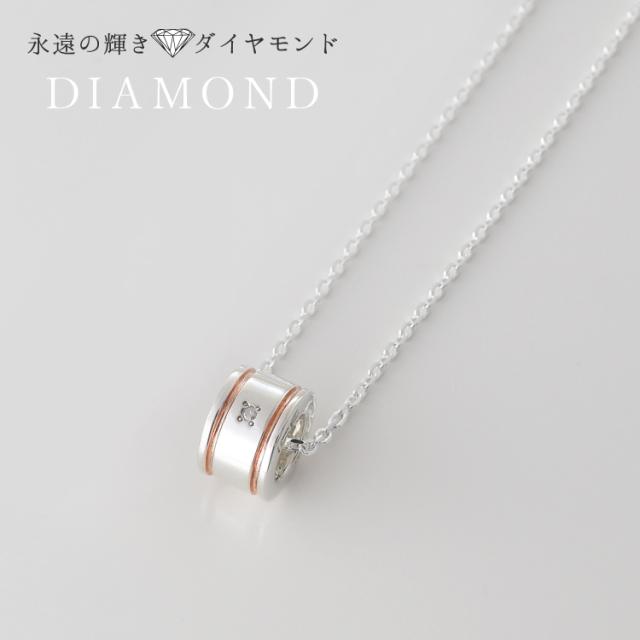 ダイヤモンドをあしらった、ピンクゴールドカラーのラインがシンプルなシルバーネックレス。