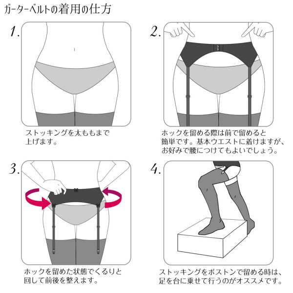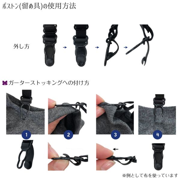 - 丁寧な使い方の説明が画像付きで書いてあったので、これに決めました。 使い勝手が良く、買って正解です! ガーターストッキングに滑り止めのゴムが付いていると、厚みによっては留め具がはまらない物もありますの...
