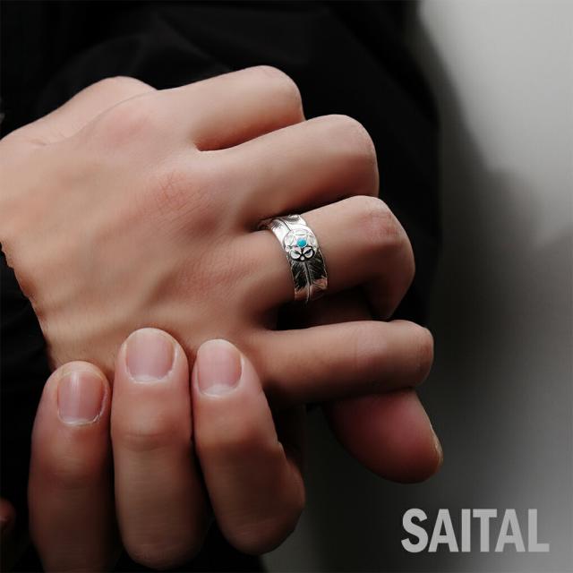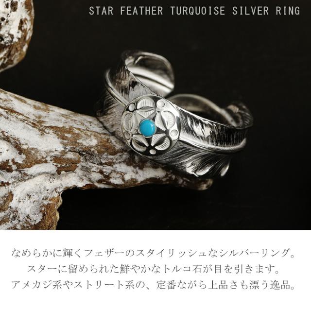 SAITAL スター フェザー ターコイズ シルバー リング 15〜23号 フリーサイズ 指輪 羽根 羽 インディアンジュエリー 風 幅広 シルバー リング トルコ石