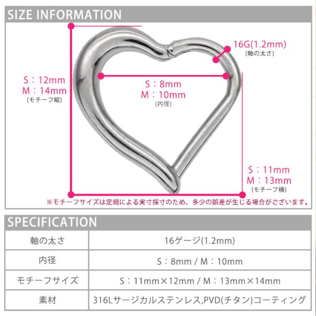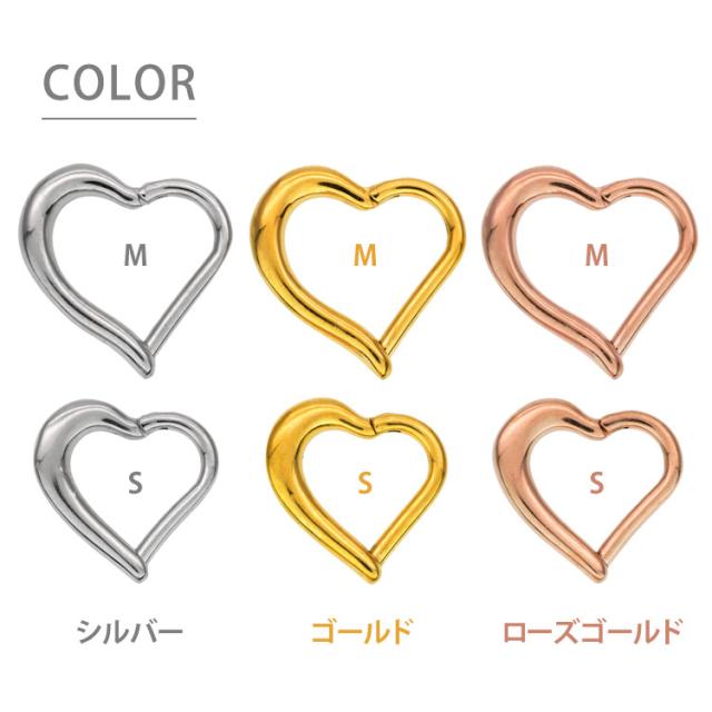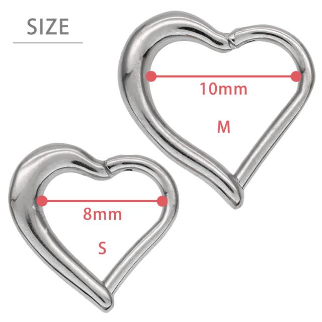 脱着が難しかったセグメントリングが、簡単ワンタッチのネオセグメントリングに生まれかわりました。 服やシーンを選ばないシンプルデザインで、オシャレの幅が広がります。シンプルな定番形の魅力が高い、ハートフォルムのリングピアス。 カラーはシルバー、ゴールド、ローズゴールドの3色、太さのサイズは16Gをご用意し、SとMの2サイズ、耳たぶピアス以外にも耳の軟骨ピアスに幅広くご使用いただけます。 素材は軽量でアレルギーが起きにくいサージカル(医療用)なので安心です。