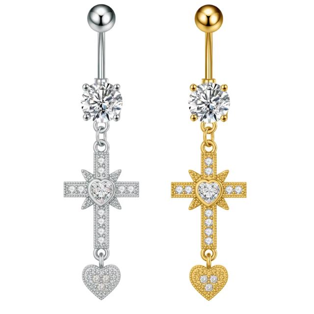 ロザリオハートチャーム へそピアス 14G 14ゲージ 十字架 クロス 揺れる 石付き ジルコニア クリスタル ラインストーン ヘソピアス 臍ピアス ボディピアス サージカルステンレス316L ボディーピアス メンズ レディース