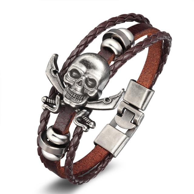 ダークブラウン色のレザーを編み込んだブレスレットにシルバーカラーの海賊旗をモチーフにしたドクロとナイフをデザインしたパーツをセットした平らな革紐ブレスレットの3連タイプのおしゃれなブレス。