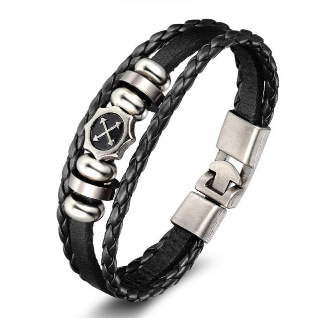 黒い色のレザーを編み込んだブレスレットにシルバーカラーのメタルの丸いプレートに矢印をクロスさせ十字架のような弓矢のようなデザインしたパーツをセットした平らな革紐ブレスレットの3連タイプのおしゃれなブレス。