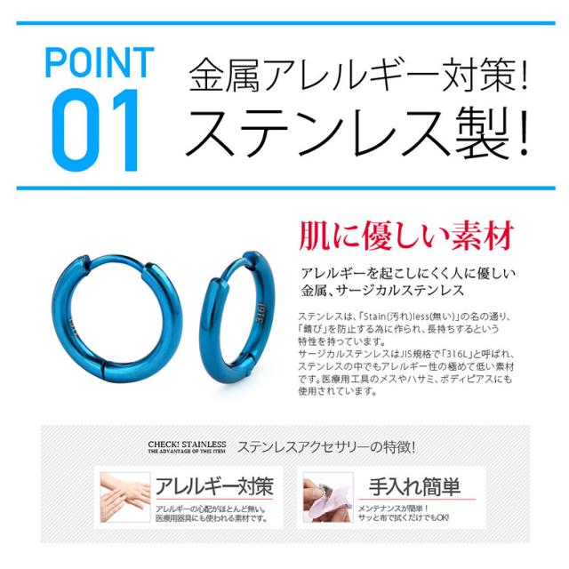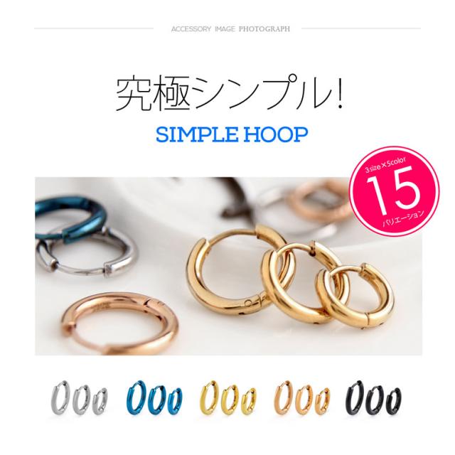 超シンプルなステンレスフープピアスです。シンプルなスタイルはもちろん、どんなファッションにも合わせやすいデザイン性で、素材は注目の316Lサージカルステンレスを使用。金属アレルギー対策としても人気の素材です。また強いコーティングで色づけを行っているので、傷やサビにも強く変色もしにくい!水の中でも使えるのでつけっぱなしでもOK!カラーとサイズで15のバリエーションをご用意しました!