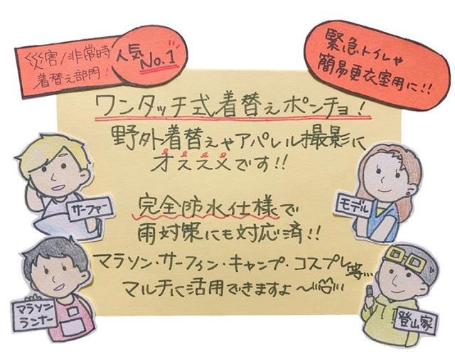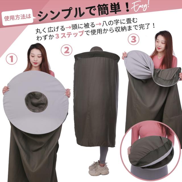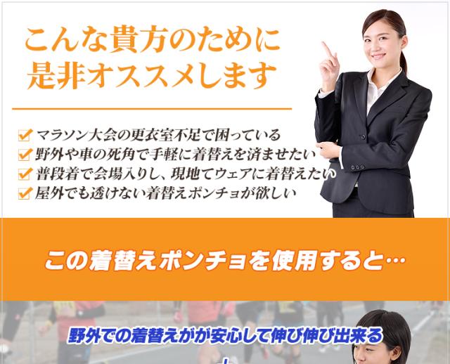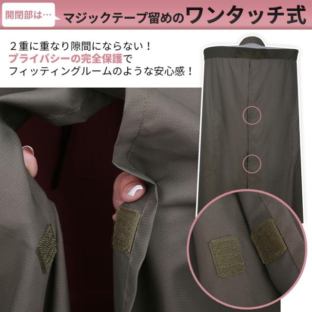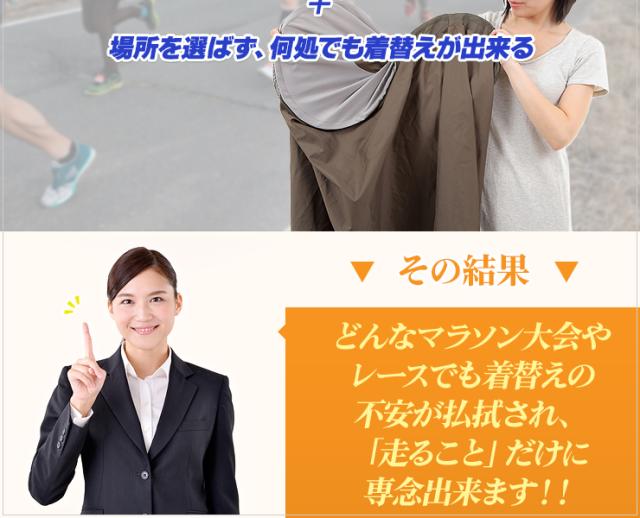 特徴:健康志向の高まりにより、マラソンブームが近年継続的に起こっています。東京マラソンなどを筆頭に大規模なマラソンレースが全国各地で行われるようになりました。参加者が大人数になる会場では、ランニングウェアに着替える場所確保が困難なことも度々あります。そんなときにオススメです。機能:太陽光の透けない遮光生地採用!日光による、着替え中に見えてしまうかもしれないという心配もありません。セクシャリティーな問題にも気にせず、マラソンスタイルに着替えられるのは大きなメリットです。 また、首元がゴム仕様になっているのと生地面積も広いので「すぐに着替えやすい」「腕をゆとりをもって広げられるので脱着がラクだった」「着替えの心配がなくなったので集中してマラソン大会に挑めた!」など、たくさんの「安心して利用できた」というお声をいただいております。使用例:ポンチョを被ったままアンダーウェアやウェアへの着替えを素肌を人前にさらすことなく可能になります。