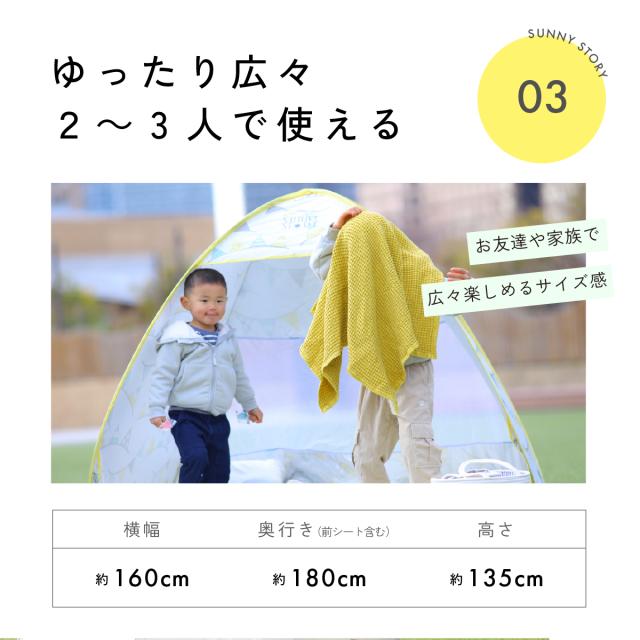 本体:(約)幅160×奥行180×高さ135cm 手提げ袋:(約)幅50×高さ50cm×持ち手26cm 素材:フレーム・スチール、生地・ポリエステル 重量:約1.2kg ※2〜3人用 ※UPF40(UV遮蔽率95.8%) ※はっ水加工 |