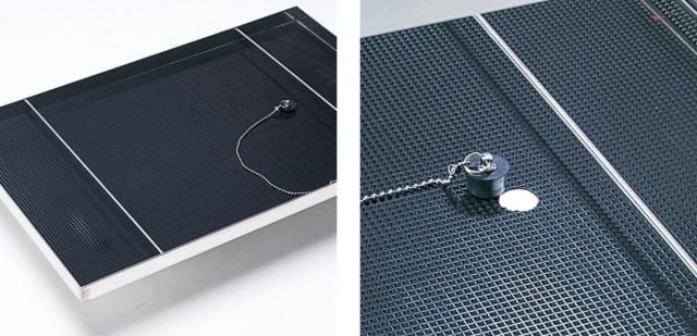 | すべり止めマット仕様 ポリ塩化ビニール製の一般用ビニール床シート(JIS規格品)の内、ピラミッドマットを使用しております。再生材を使用しています。 | 水受皿/抜栓仕様 水受皿材質に高級ステンレスを使用しており、耐久性に優れています。 |