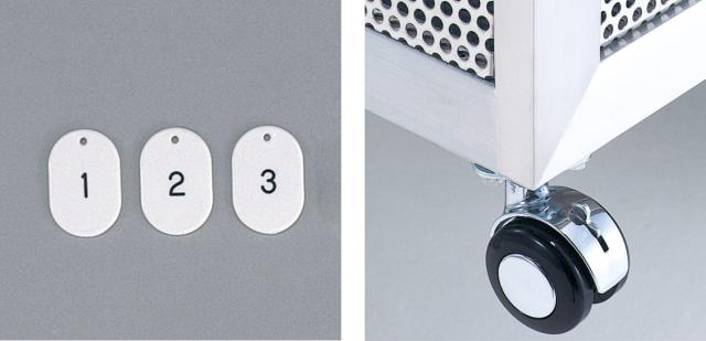 | キー札付き 各鍵にアクリル製のキー札が付属しています。ナンバー付きですので、管理がしやすいです。 | キャスター仕様 ナイロン製で双輪タイプの標準仕様キャスターです。車輪径は直径5cmで4輪共ストッパー付です。カーペット、リノリューム等の平坦な床面に適しています。 |
