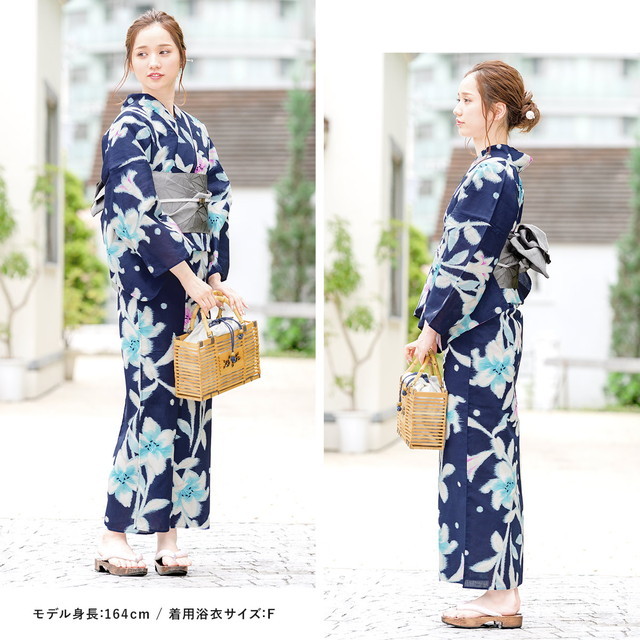 浴衣セット レディース レトロ 作り帯 浴衣セット 大人 3点セット 紺 ネイビー グレー 百合 花 水玉 綿麻 女性 ボヌールセゾン フリー