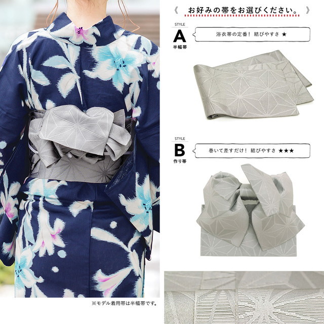 帯は、体に巻いて後ろで結ぶタイプの半幅帯、または作り帯からお選びいただけます。モデル着用は半幅帯です。