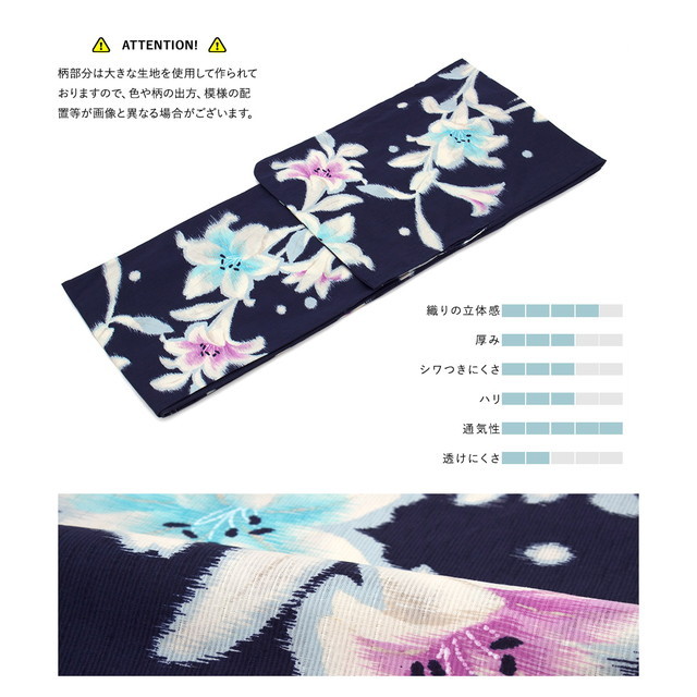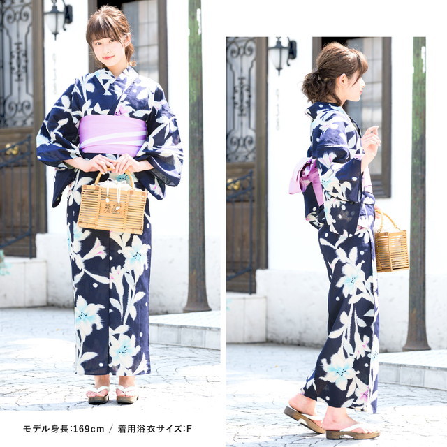 浴衣セット レディース レトロ 作り帯 浴衣セット 大人 3点セット 紺 ネイビー 薄紫 百合 花 水玉 綿麻 女性 ボヌールセゾン フリー