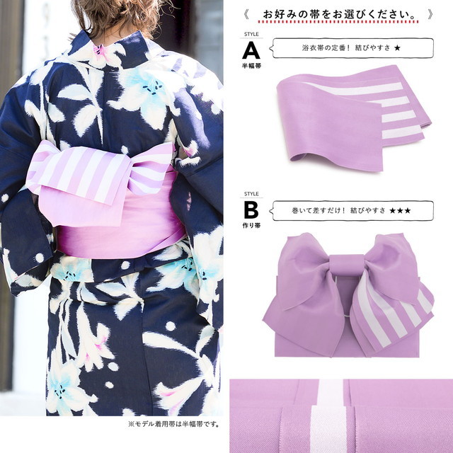 帯は、体に巻いて後ろで結ぶタイプの半幅帯、または作り帯からお選びいただけます。モデル着用は半幅帯です。