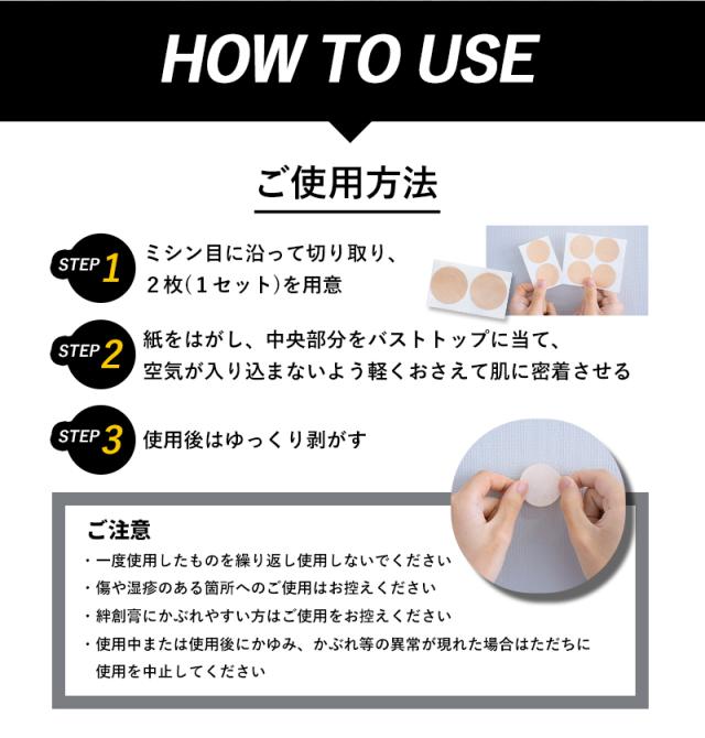 | 特徴 | 汗に強い、2WAYニップレス 【ファッションとしてオススメ】 真ん中の丸い裏紙を残す:シールに厚みが出て、突起を完全にガード!「乳首が大きい、突起がひどくて隠せるか不安」そんな方でも安心してご利用いただけます! 【スポーツ利用としてオススメ】 裏紙を全て剥がす:シール全体が肌に密着するので、剥がれにくい!マリンスポーツや長時間の運動、汗をたくさんかくシーンでオススメ♪より剥がれにくくなります! |