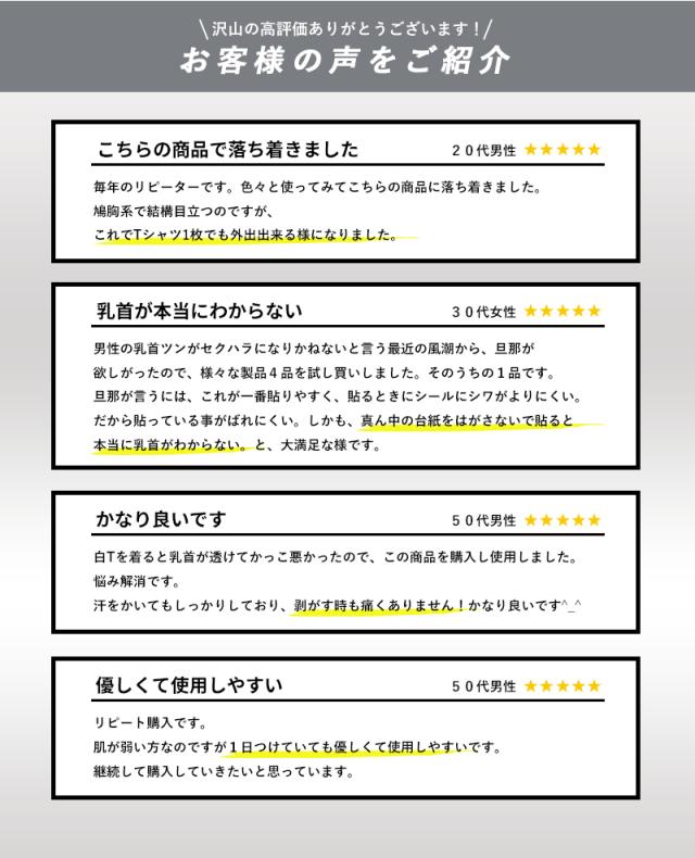 - このニップレスは乳首が全然目立たなくなるだけではなく、貼りやすく剥がしやすいし剥がすときに痛みもなく私の想像以上にかなり良い商品だと思いました。また近々購入しようと思います。