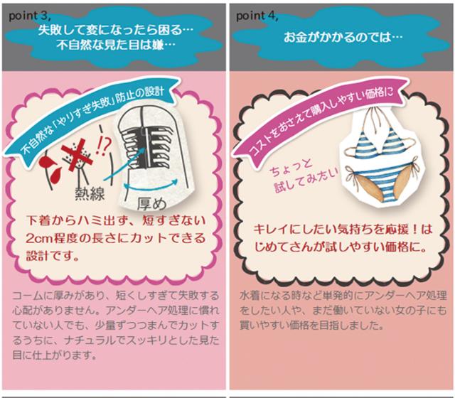 ● ヒートカット方式で毛先を丸くカット。下着からも水着からもツキ出ない。