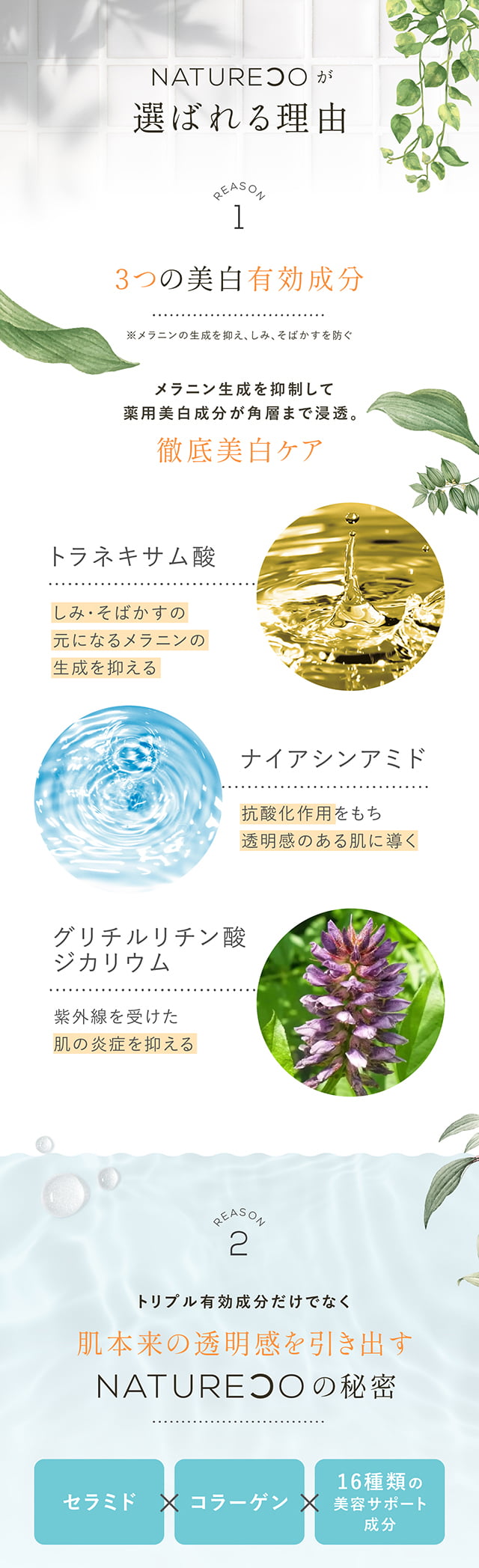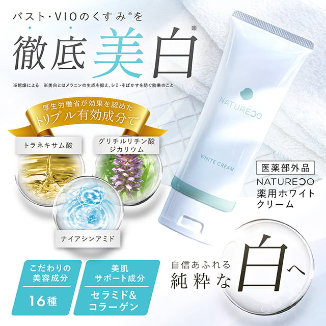 | 特徴 | マッサージオイルで有名なナチュレコシリーズから待望の薬用ホワイトクリームが登場! 身体の気になる黒ずみ部分に塗るとメラニンの生成を抑え、黒ずみ、しみ、そばかすを防ぐ!また、保湿効果もあるため、乾燥から肌を守ります!日本製で医薬部外品の薬用ホワイトクリームなので安心してご使用いただけます。 |