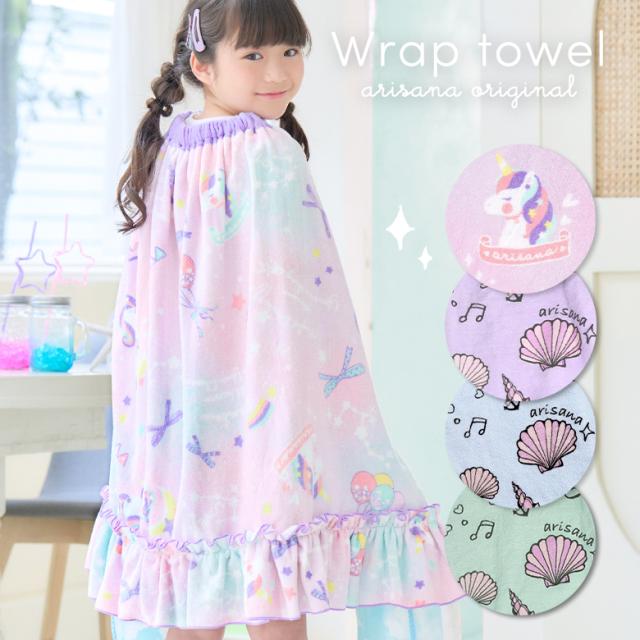 ラップタオル キッズ 女の子 70cm 子供 プールタオル 巻きタオル 着替えタオル ビーチタオル プール 水泳 スイミング フリル 貝殻柄 ユニコーン リボン ラベンダー ミント ブルー arisana