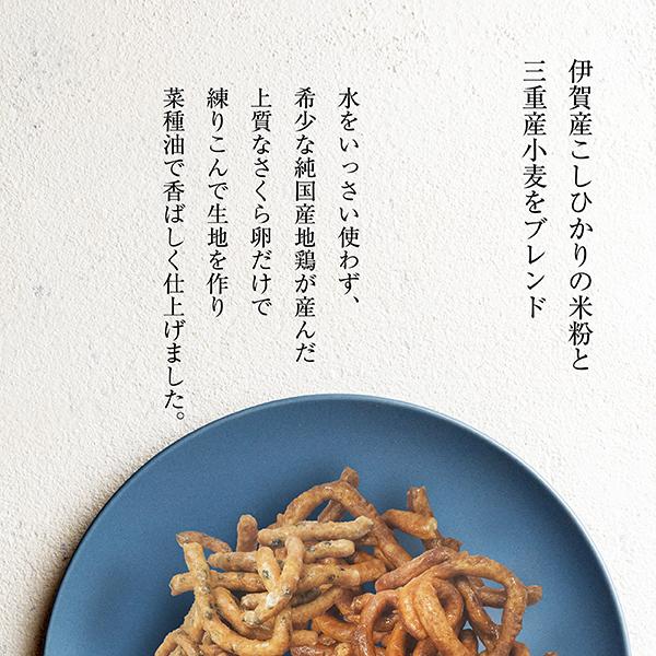 小麦粉に伊賀産コシヒカリの米粉を混ぜ、水を一切使わず純国産地鶏のさくら卵だけを使い生地を練り上げ、菜種油で香ばしく仕上げました。