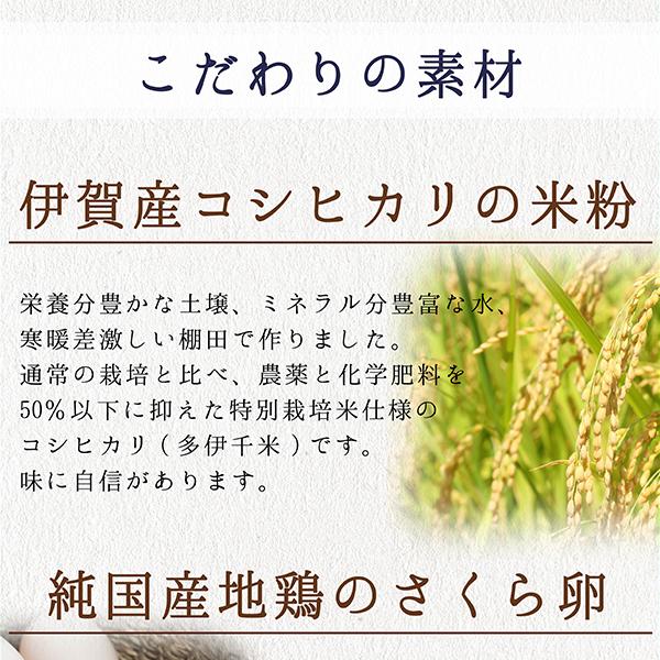 ■原材料:米粉(伊賀産)、卵(伊賀産)、砂糖、バター(国産)、生クリーム(国産)、アーモンドプードル、はちみつ、粉乳、コンスターチ