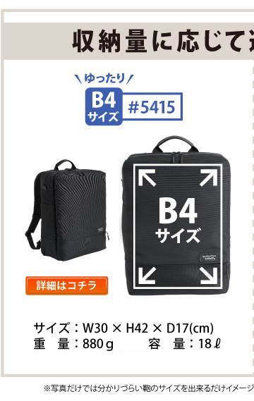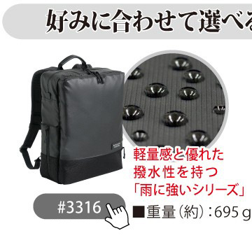 本体に軽量樹脂フレームを内蔵し、型崩れしにくく、自立しやすい仕様。本体前面に2種類の生地を使用したコンビネーションデザインデザイン。小物の収納に便利なポケットが充実。チェストベルトの取り外しができ、ショルダーベルトへの取り付け位置を3段階で調整できます。背面にはトローリーバッグに取り付けられるセットアップ用ベルト付き。A4サイズ対応。