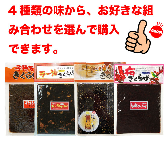 「ラー油きくらげ」「子持ちきくらげ」「梅きくらげ」「ごま油きくらげ」