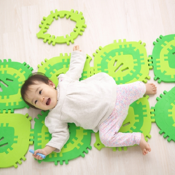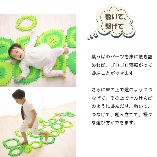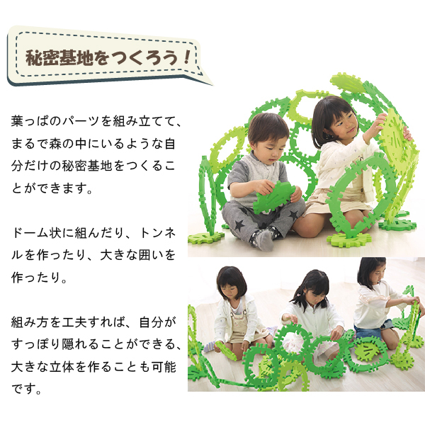 クムタスは、葉っぱの形をした大中小3種類のパーツを組み合わせて遊べる玩具です。